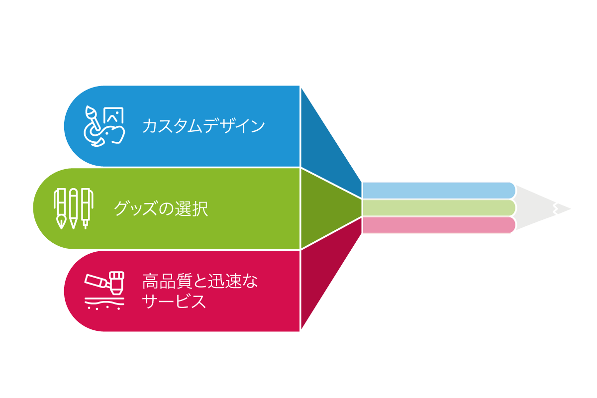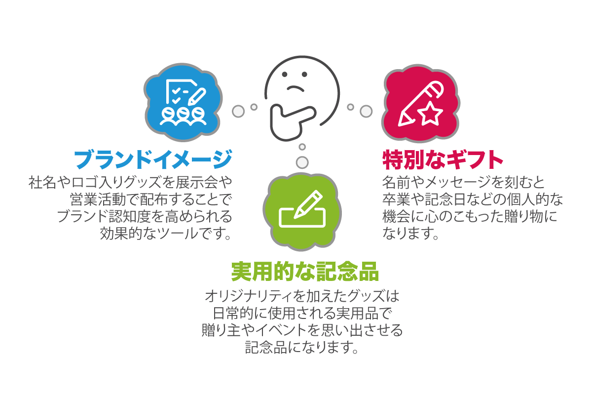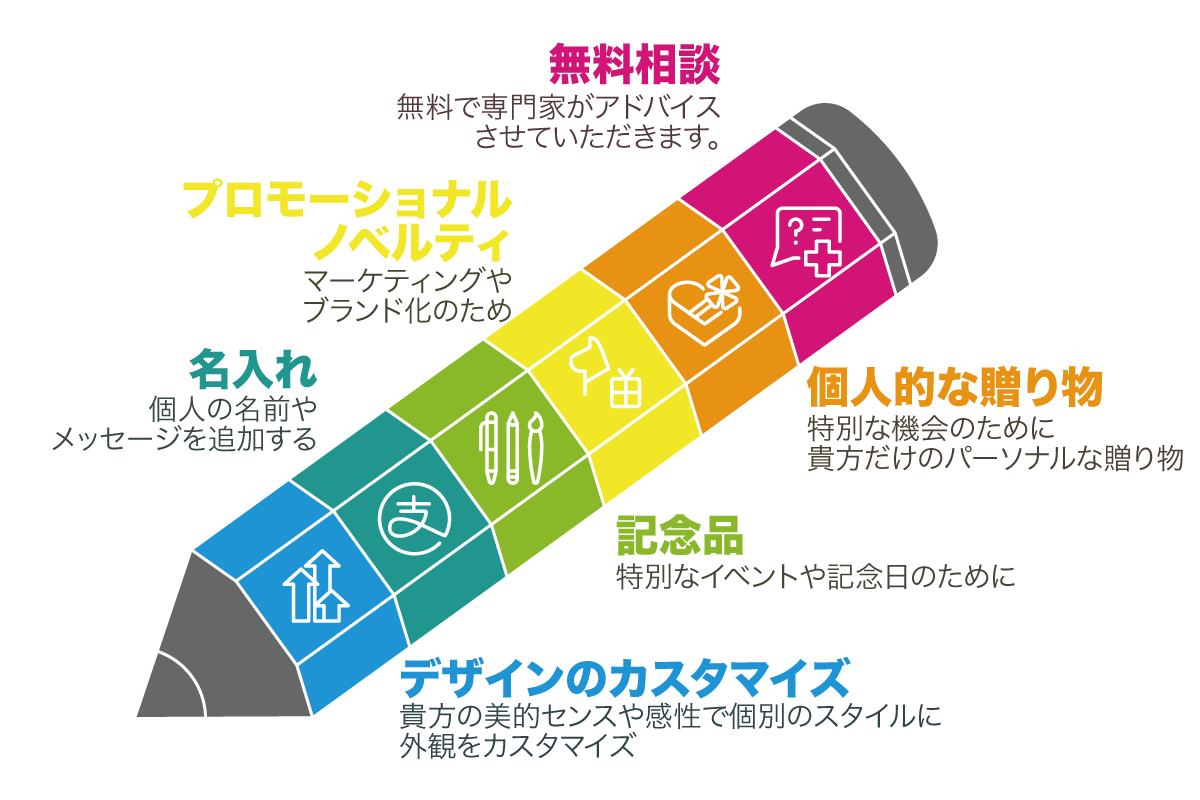 ◆実用的で記憶に残る◆ ボールペンなどのグッズは日常的に使う実用品。 オリジナリティを加えることで、 使うたびに贈り主やイベントを思い出させる 特別な記念品になります。